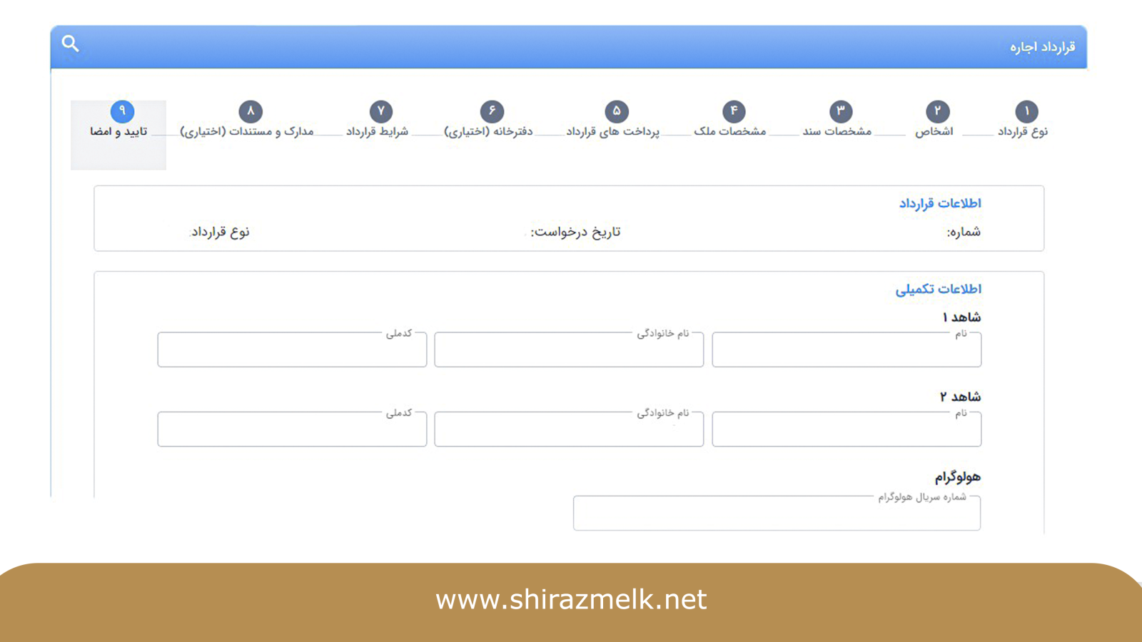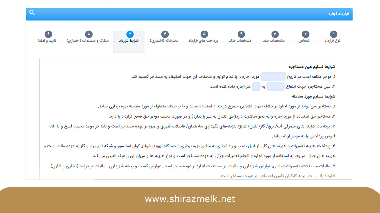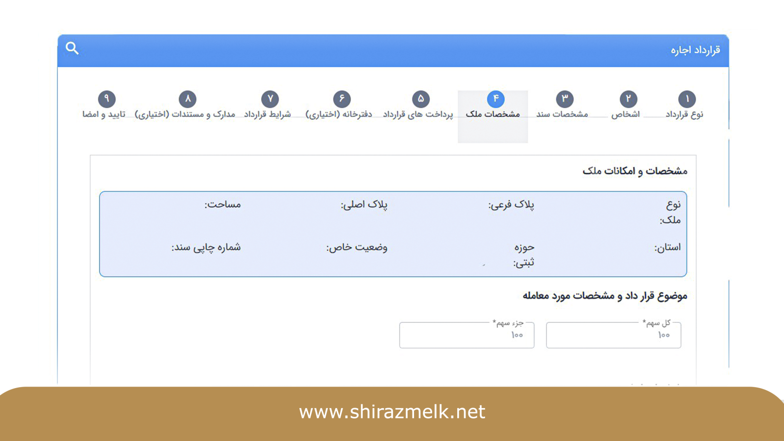 در این مرحله میبایست موضوع قرارداد , مشخصات معامله و امکانات ملک را وارد نمایید .