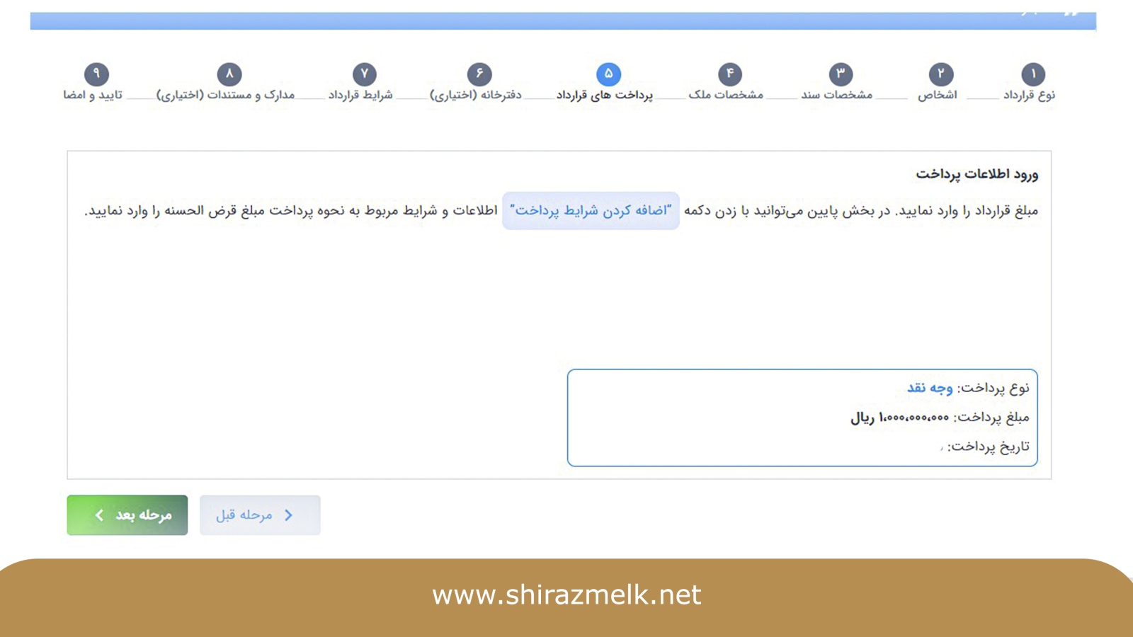 در این مرحله لازم است مبلغ قرارداد را وارد کنید. پس از وارد کردن مبلغ، در بخش پایین صفحه، گزینهای با عنوان “افزودن شرایط پرداخت” وجود دارد. با کلیک بر روی این دکمه، میتوانید جزئیات دقیقتری درباره نحوه پرداخت قرارداد مانند تعداد اقساط، زمانبندی پرداختها، مبلغ هر قسط، پیشپرداخت را وارد کنید. این اطلاعات به شما کمک میکند تا تمامی شرایط مالی قرارداد به صورت شفاف و دقیق ثبت شود و از هرگونه ابهام در آینده جلوگیری گردد.