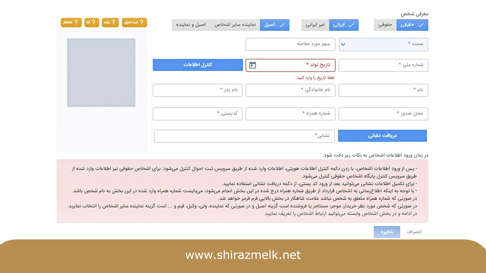 در این بخش اطلاعات تمامی اشخاص قرارداد یعنی خریدار، فروشنده، وکیل، نماینده و … را با زدن دکمه اضافه کردن شخص جدید وارد نمایید.