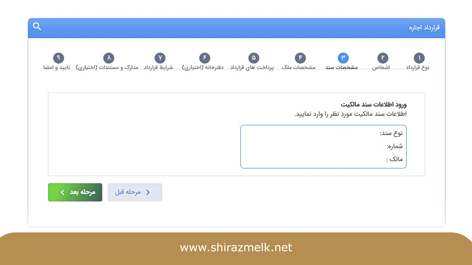 در این مرحله لازم است اطلاعات سند ملک وارد شود. این بخش شامل انواع مختلف سند است و با انتخاب نوع سند، بخشهای مربوطه برای تکمیل نمایش داده میشوند.